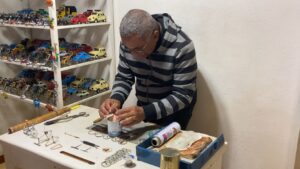 Die Mini-Velos hat Mamy Harivelo Rajamason aus Antsirabe in Madagaskar geschaffen. Seit 1990 fertigt er die kunstvollen Einzelstücke aus allerlei Recyclingmaterial wie Blechdosen, Bremskabelhüllen und Elektroleitungen. Die Mini-Velos sind Unikate und rund 13 x 8 cm gross.
